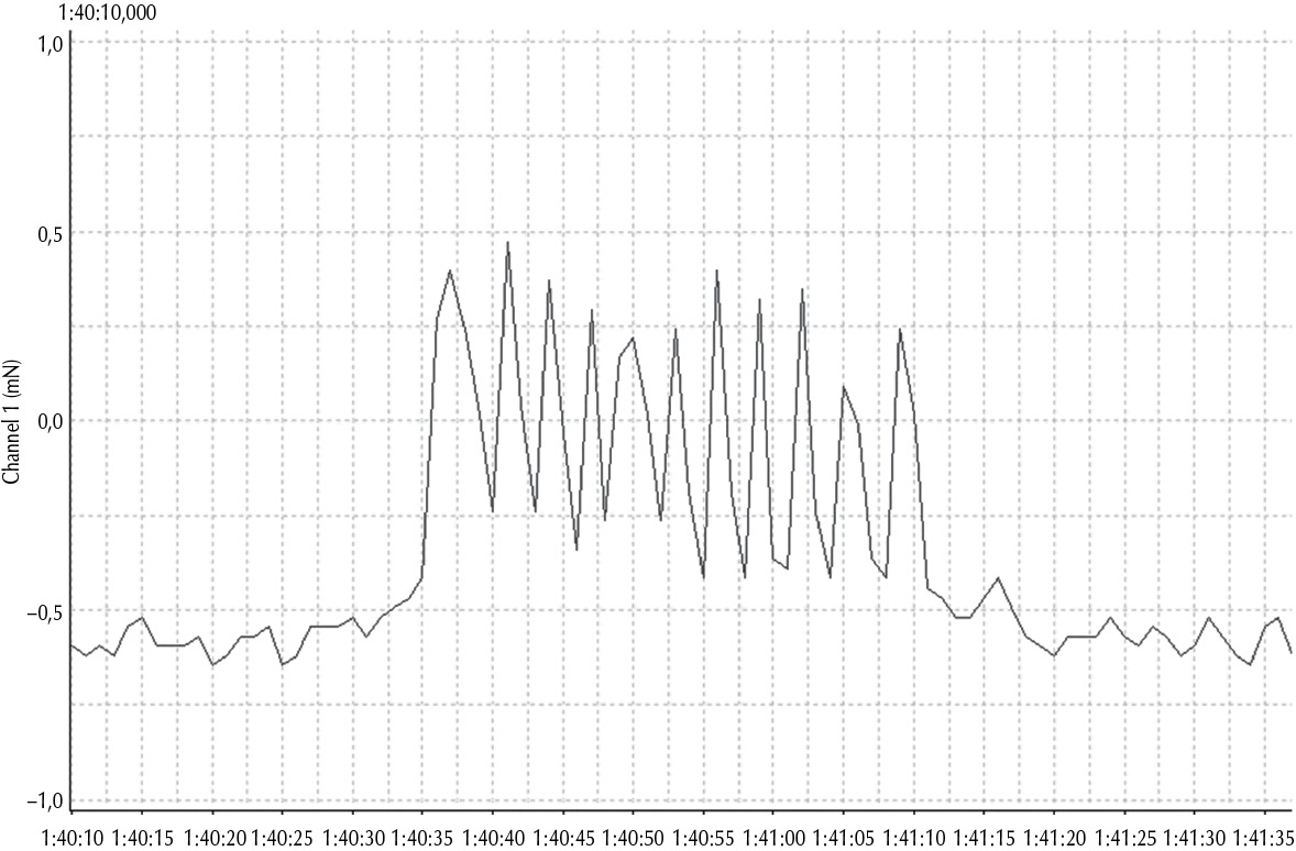 Рис. 1. Одиночное сокращение лимфангионов брыжейки крысы