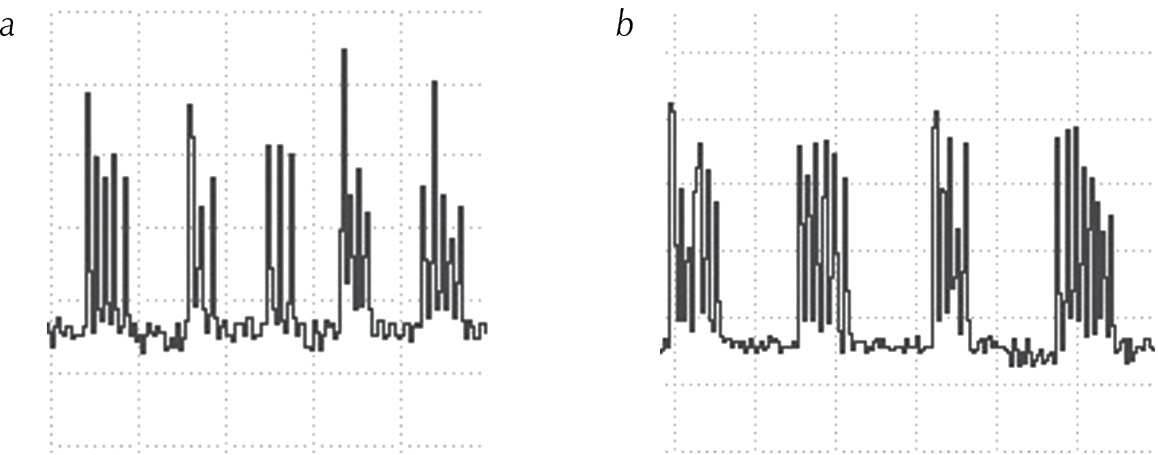 Fig. 2. Recording of the contractive activity of the intact lymphatic vessels (background) (а); recording of the contractile activity of the lymphatic vessels when exposed to β-endorphin on the background of Glb (b)