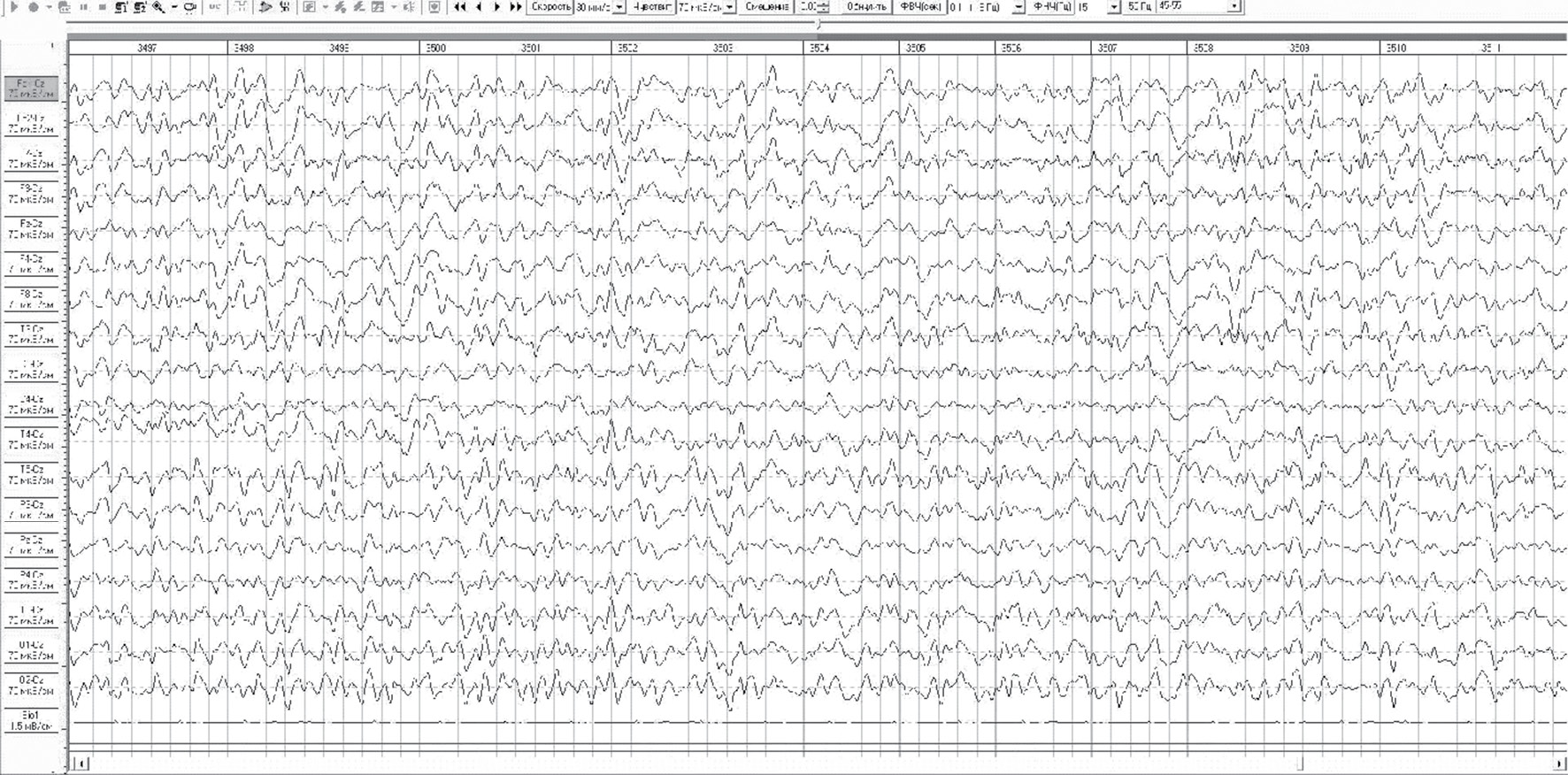 Fig. 1. A typical example of an EEG theta-coma pattern: diffuse slow-wave activity with a large proportion of theta-band (5–6–7 Hz) with an amplitude of 30–40 µV (patient K., 36 years old, acute severe ethanol poisoninge, the concentration of ethanol in the blood is 4.8‰, in the urine — 7.3‰; coma-1, level of consciousness — 9 points GCS)