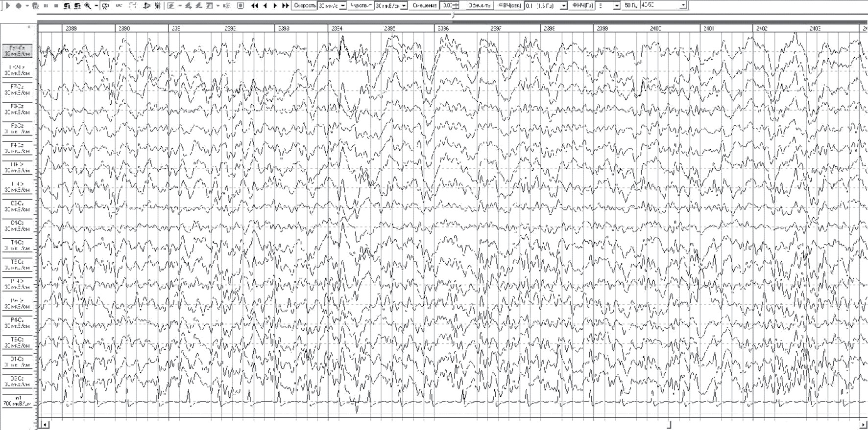 Рис. 2. Типичный пример ЭЭГ паттерна «дельта-кома»: диффузная дельта-активность с частотой 2–3 Гц и амплитудой до 50 мкВ, устойчивая к внешней стимуляции (пациент Р., 42 года, острое отравление этанолом тяжелой степени, концентрация этанола в крови — 5,6 ‰, в моче — 7,5 ‰; кома-2, уровень сознания 5 баллов GCS)