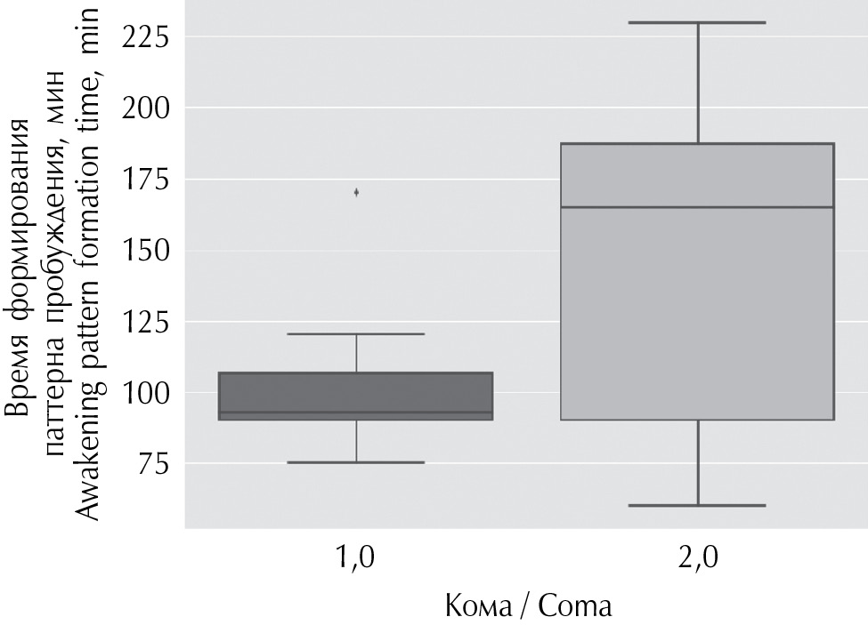 Рис. 4. Время формирования паттерна пробуждения на ЭЭГ у больных с тяжелым отравлением этанолом при различном уровне угнетения биоэлектрической активности: кома-1.0 — паттерн тета-комы, кома-2.0 — паттерн дельта-комы. Высота бокса ограничивает межквартильный размах (IQR) между первым и третьим квартилями; линия в боксе — медиана; интервалы ограничивают значения ± 1,5 IQR