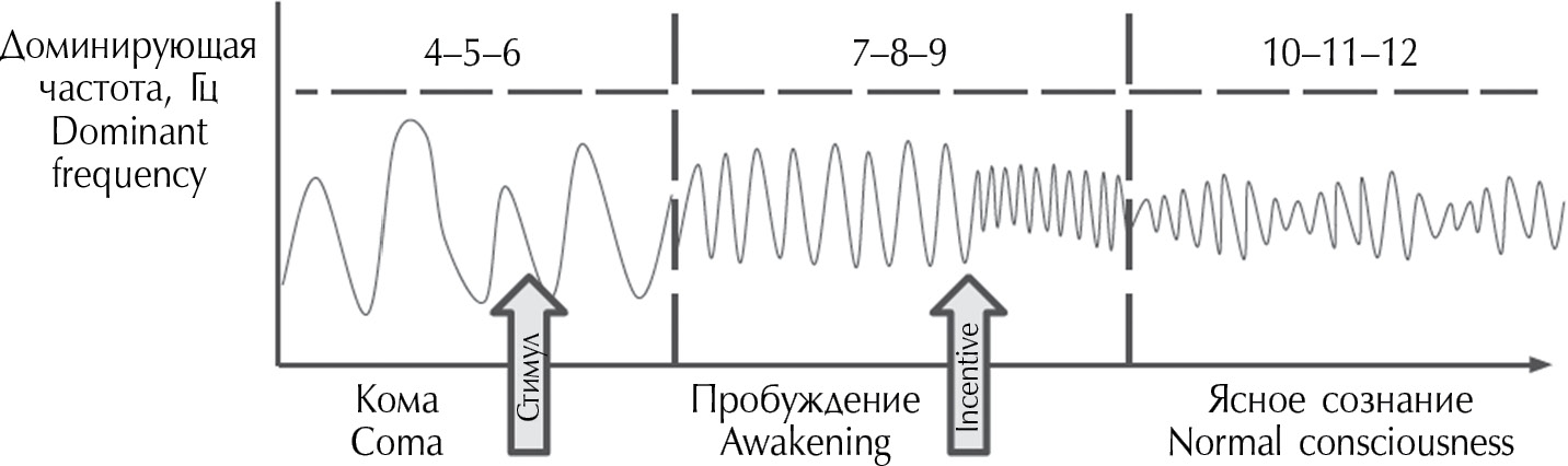 Электроэнцефалографические корреляты церебральной недостаточности при коматозных состояниях отличаются выраженным полиморфизмом и высокой индивидуальной вариабельностью. С учетом этих особенностей в качестве прогностических критериев следует использовать «динамические» параметры: спонтанность и изменчивость паттерна, реактивность при стимуляции. Повышение частоты биоэлектрической активности, десинхронизация при внешних стимулах могут свидетельствовать о начавшемся процессе восстановления сознания. Электрофизиологические критерии пробуждения, разработанные в данной работе на примере алкогольной комы, могут быть применимы и к бессознательным состояниям, вызванным другими этиологическими факторами: травмой, гипоксией, сосудистой катастрофой. Исследование динамики электрофизиологических показателей при помощи ЭЭГ в состоянии комы и, в частности, паттерна пробуждения является важным аспектом реанимационной ЭЭГ. Необходимы дальнейшие исследования в этой области, которые позволят сформировать критерии паттерна пробуждения для более длительных бессознательных состояний.