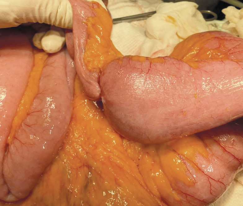 Рис. 2. Интраоперационная картина: образование тонкой кишки, стенозирующее ее просвет, с выраженным супрастенотическим расширением