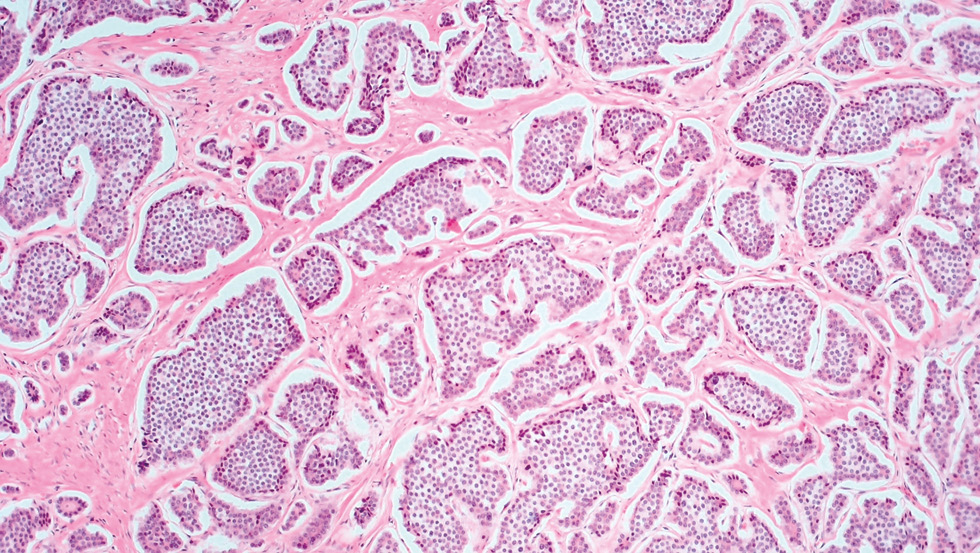 По данным патогистологического исследования, обнаружена высокодифференцированная нейроэндокринная опухоль тонкой кишки типа А, прорастающая все слои стенки кишки с инвазией в жировую клетчатку брыжейки. Отмечаются многочисленные гнезда опухолевой ткани, сформированные однотипными округлыми клетками с овальным ядром и хроматином по типу «соль и перец» с тенденцией к выраженному розеткообразованию (рис. 3, 4). Митозы немногочисленны (соответствуют нейроэндокринной опухоли I степени — NET G1). Отмечается периваскулярный рост с участками инвазии опухолевой ткани в стенку сосудов, данные за периневральный рост положительные. Края резекции без признаков продолженного опухолевого роста. В лимфатических узлах (1 единице) перифокально отмечаются очаги опухолевой ткани. В жировой клетчатке выявлены единичные депозиты опухолевой ткани, просвет единичного сосуда обтурирован опухолевым эмболом.