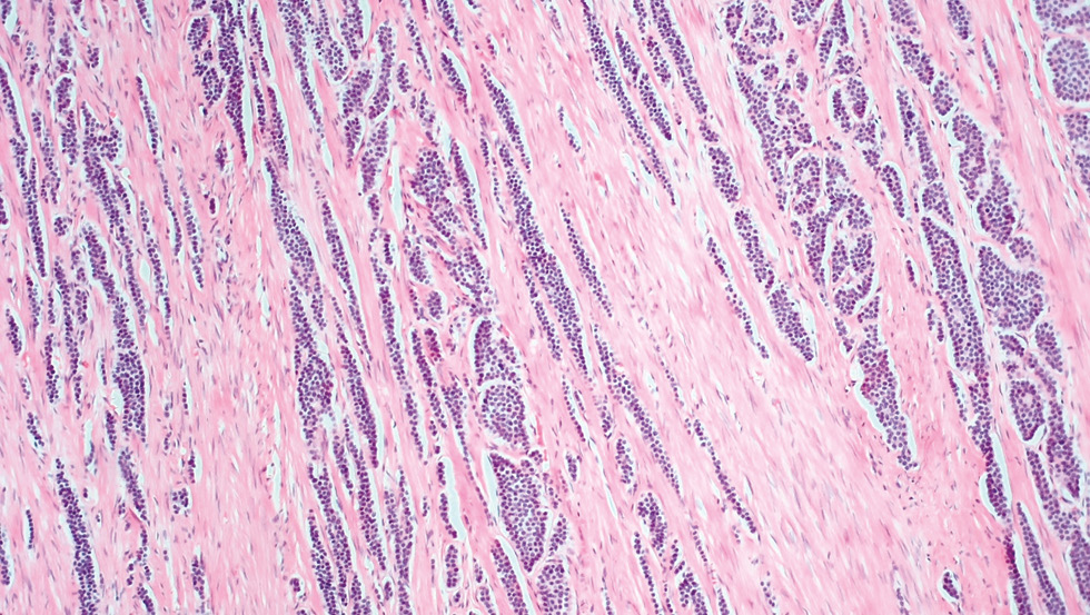 Рис. 4. Микроскопическая картина инвазии опухоли тонкой кишки в мышечный слой (гематоксилин-эозин, увеличение ×100)