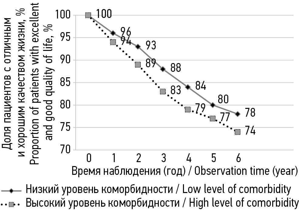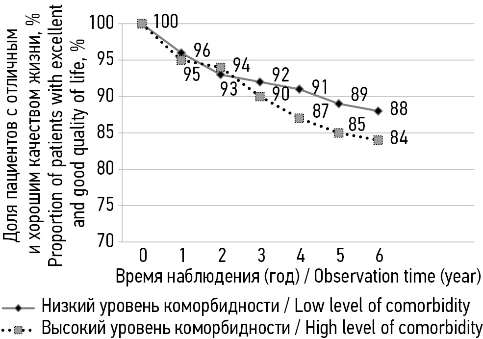 MATERIALS AND METHODS: The groups of patients with comorbidity and without significant concomitant pathology have been compared. The first group included 806 patients aged 19 to 88 years who underwent primary total hip replacement in the Clinic of Traumatology and Orthopedics of the North-Western State Medical University named after I.I. Mechnikov from 2014 to 2018 in connection with osteoarthritis. The second group consisted of 376 patients aged 43 to 85 years who underwent primary total KR due to osteoarthritis in the V.A. Baranov Republican Hospital (Petrozavodsk) in 2016–2019. Statistical data processing and graph design have been carried out with R programming language with open access via https://cran.r-project.org. The probability of maintaining a satisfactory assessment of the quality of life by a certain observation point t (year of observation) has been assessed using the Kaplan–Mayer method. The logrank test has been used in order to compare the probability of maintaining a satisfactory assessment of quality of life during the entire follow-up period in the groups of patients with and without polymorbidity.