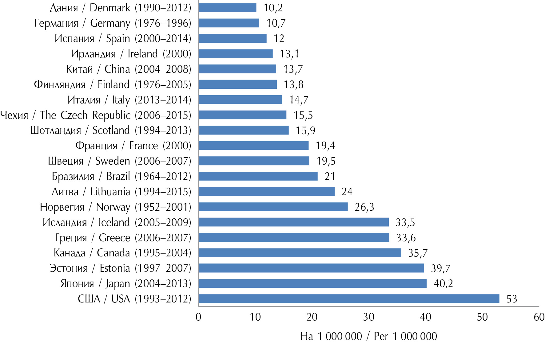 Рис. 1. Частота позвоночно-спинномозговой травмы в разных странах