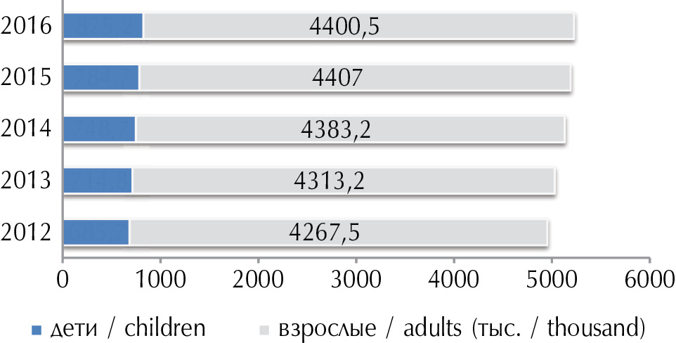 По данным официальной статистики (Управление Федеральной службы государственной статистики по Санкт-Петербургу и Ленинградской области) [17], количество взрослого населения увеличилось с 4 267 500 человек в 2012 г. до 4 400 500 человек в 2016 г. (рис. 2).