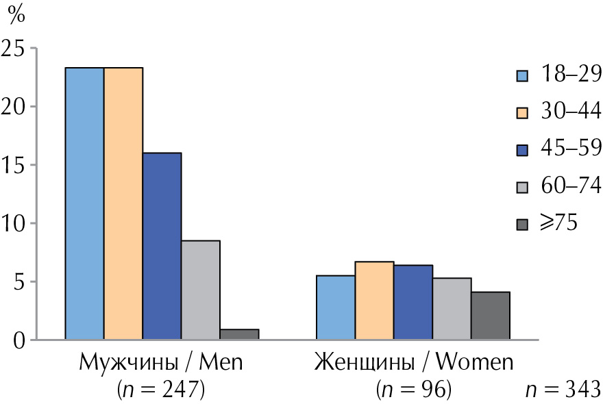 Выявленные гендерные и возрастные особенности — значительное преобладание мужчин молодого возраста и изменение этого соотношения среди лиц пожилого возраста — аналогичны данным большинства зарубежных публикаций [17, 21] и отечественных исследований [2, 8, 13, 14]. По данным литературы, соотношение мужчин и женщин в развитых странах варьирует от 3,0 : 1 до 4,3 : 1. Что касается развивающихся стран, то самое низкое соотношение мужчин и женщин (1,73 : 1) зарегистрировано в Китае, тогда как в Пакистане и Бангладеш отмечается самое высокое соотношение — 20,33 : 1 и 7,5 : 1 соответственно [11], что, видимо, связано со стилем жизни и разной степенью активности женщин по сравнению с мужчинами в различных странах.