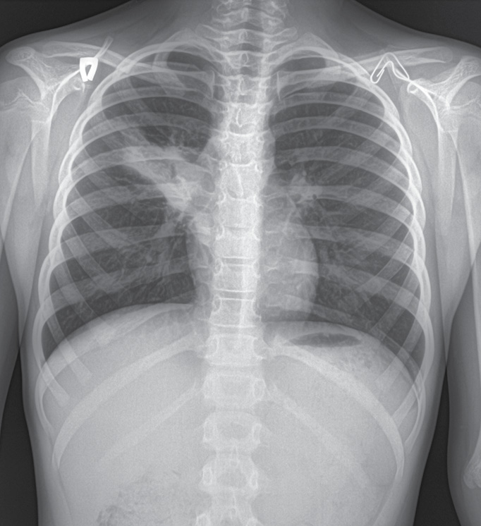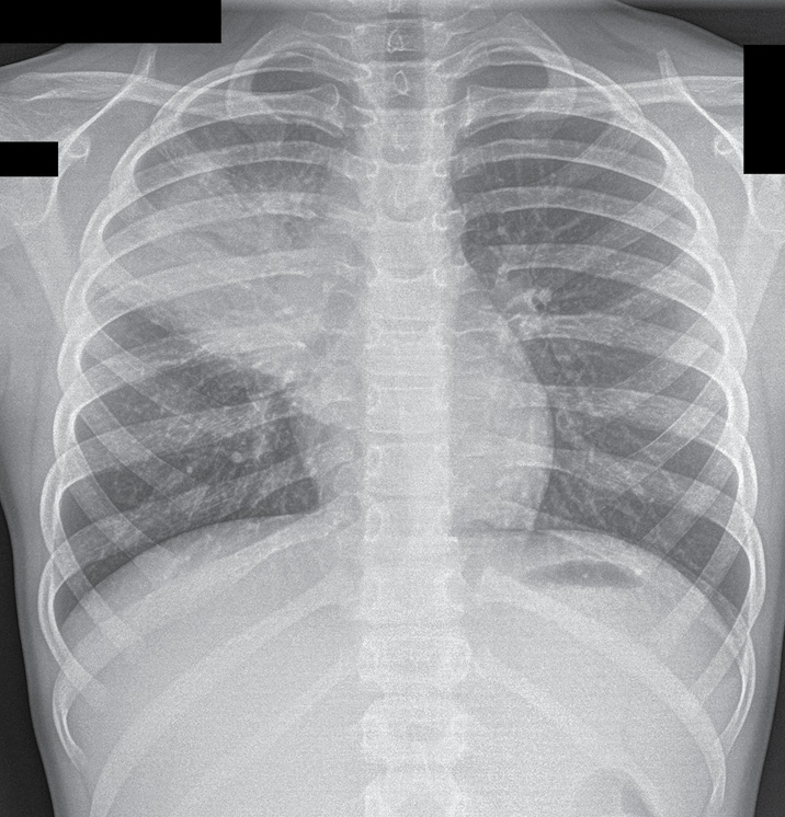 17.05 при поступлении в отделение пульмонологии состояние ребенка средней тяжести, температура — 36,7 °C, жалобы на кашель. ЧД — 22 в минуту, ЧСС — 104 уд/мин, SpO2 — 98 %. Кашель незначительный, продуктивный. Дыхание ослаблено справа над S3; притупление перкуторного звука в проекции S3 справа; хрипы единичные, влажные и сухие. Сердце, органы брюшной полости без особенностей. Физиологические отправления в норме.