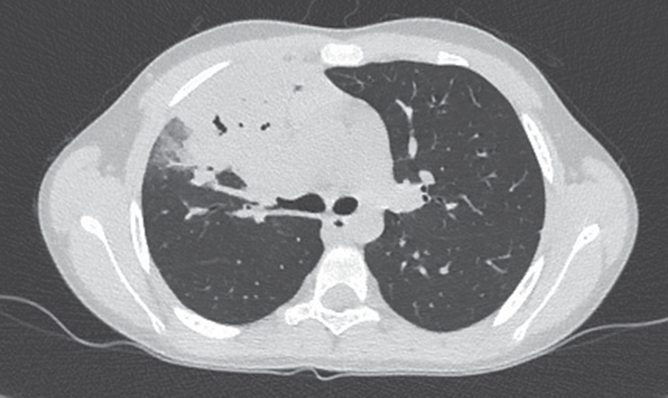 27.04 на рентгенограмме органов грудной клетки (ОГК) в двух проекциях определялось выраженное неоднородное затемнение легочной ткани по типу пневмонической инфильтрации в проекции S2–S3 справа. Легочный рисунок в зоне инфильтрации не прослеживался. Подчеркнута и подтянута кверху горизонтальная междолевая плевра. Тень сердца размыта в верхних отделах справа. Контуры диафрагмы четкие, ровные, плевральные синусы свободны (рис. 1).
