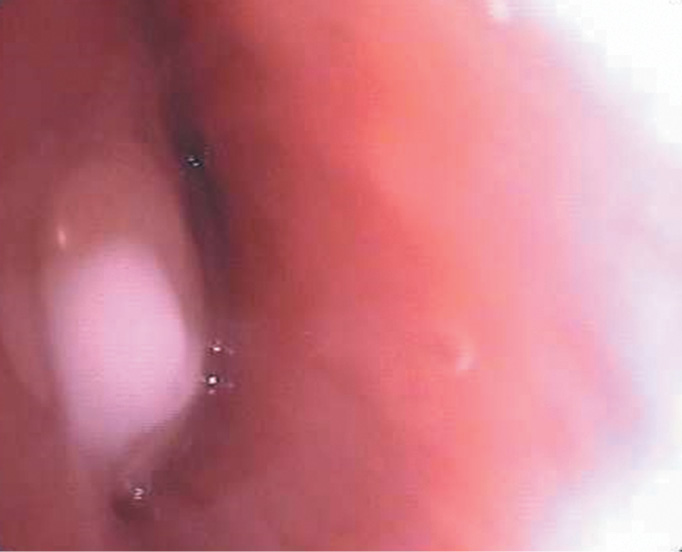 Рис. 4. Видеобронхоскопия ребенка Н., 8 лет 7 мес., 21.05. Образование и обтурация бронха В3 справа. Эндоскопическая картина похожа на туберкулезное поражение лимфатического узла