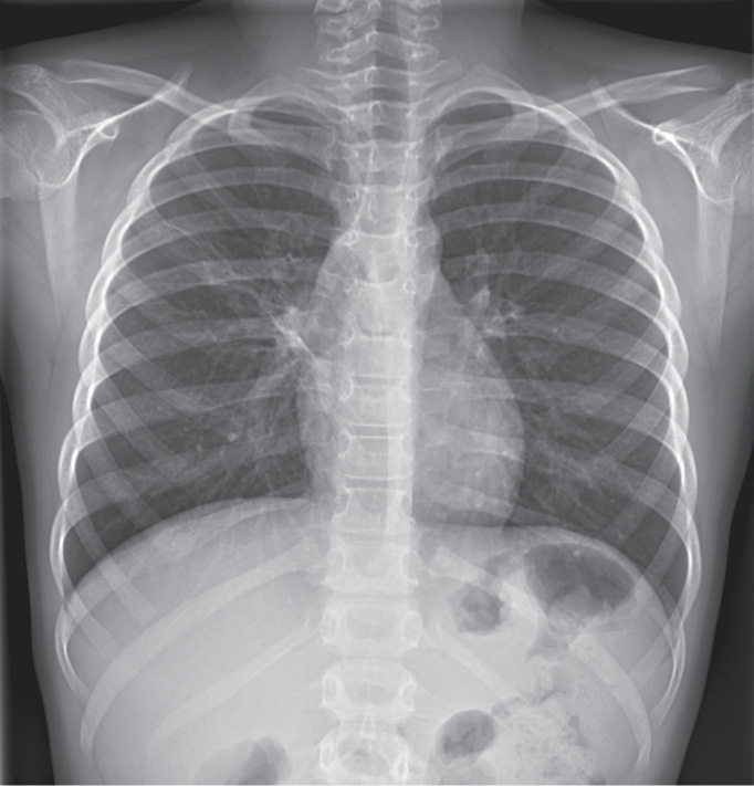 Анамнез болезни. В первую неделю болезни отмечались субфебрильная температура и катаральные симптомы, лечилась симптоматически. С 16.04 появились высокая лихорадка и кашель. С 17.04 по 23.04 получала кларитромицин перорально в дозе 7,5 мг/кг в сутки. 18.04 на рентгенограмме органов грудной клетки обнаружены инфильтративные изменения без четких контуров в S1–S2 справа и в проекции правого корня легкого (не исключено, что за счет бронхопульмональных лимфоузлов). В клиническом анализе крови — лейкоцитоз, нейтрофилез, повышение ESR. Ввиду отсутствия положительной динамики с 23.04 кларитромицин отменен, назначен цефтриаксон внутримышечно один раз в сутки в дозе 37 мг/кг в сутки, после чего наблюдалось небольшое улучшение состояния — увеличились интервалы между подъемами температуры.