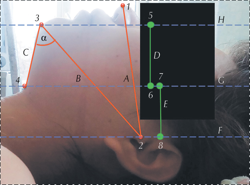 Рис. 1. Фотография человека в профиль с выделенными ориентирами. Точка 1 — кончик носа, точка 2 — козелок, точка 3 — подбородочный выступ, точка 4 — точка визуального перехода шеи в субмандибулярную область. Отрезок А соединяет точки 1 и 2, отрезок B соединяет точки 2 и 3, отрезок С соединяет точки 3 и 4. Линия F лежит во фронтальной плоскости на уровне точки 2 (козелка). Линия G лежит во фронтальной плоскости на уровне точки 4. Линия H лежит во фронтальной плоскости на уровне точки 3. Отрезок D соединяет линии G и H. Отрезок E соединяет линии G и F. Угол α — субмандибулярный угол