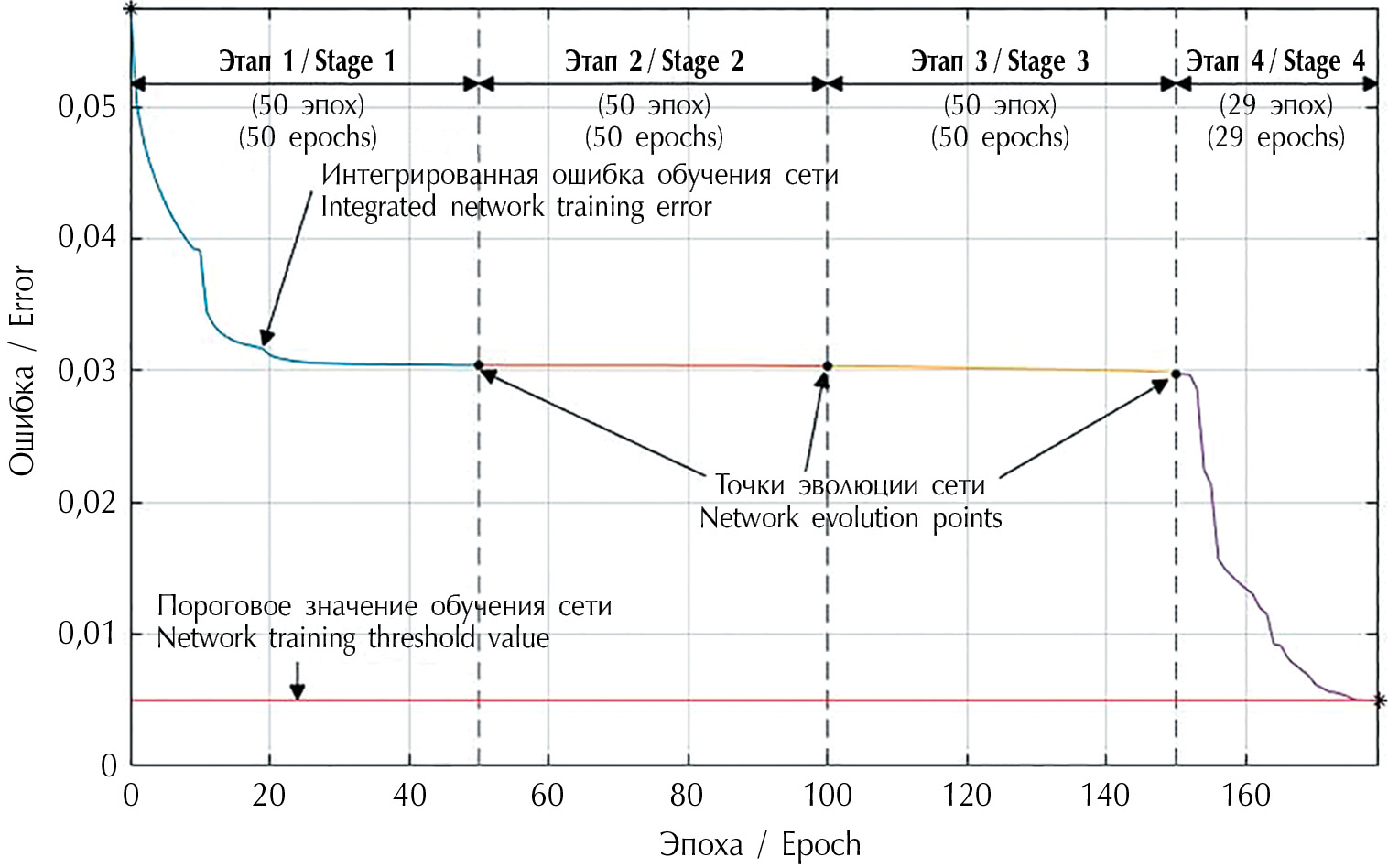 На рис. 2 приведен график поэтапной эволюции интегрированной ошибки обучения нейронной сети.