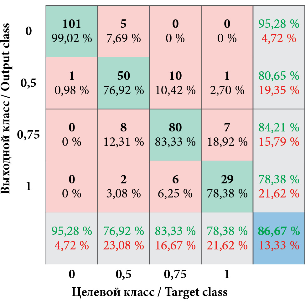 Средняя эффективность работы нейронной сети, обученной на исходной выборке, составила 86,67 % (рис. 3). Качество работы классификатора оценивали путем тестирования с применением выборки исходной базы данных, которую не использовали в обучении, оно составило 92,3 %, что является приемлемым результатом, позволяющим использовать классификатор в практической деятельности в качестве системы поддержки принятия решения.