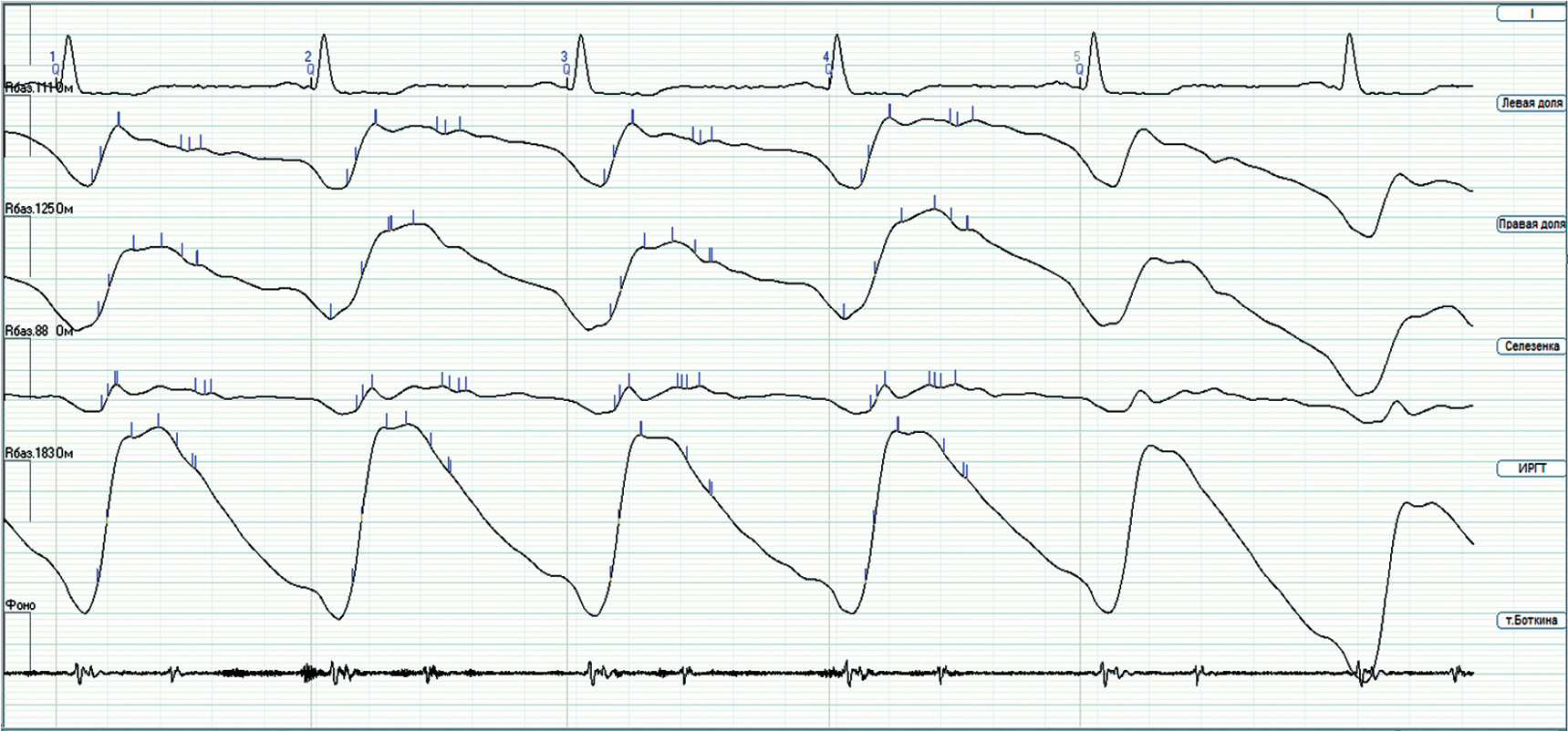 Рис. 1. Полигепатограмма при нарушении венозного оттока (исходно, задержка дыхания на полувыдохе)