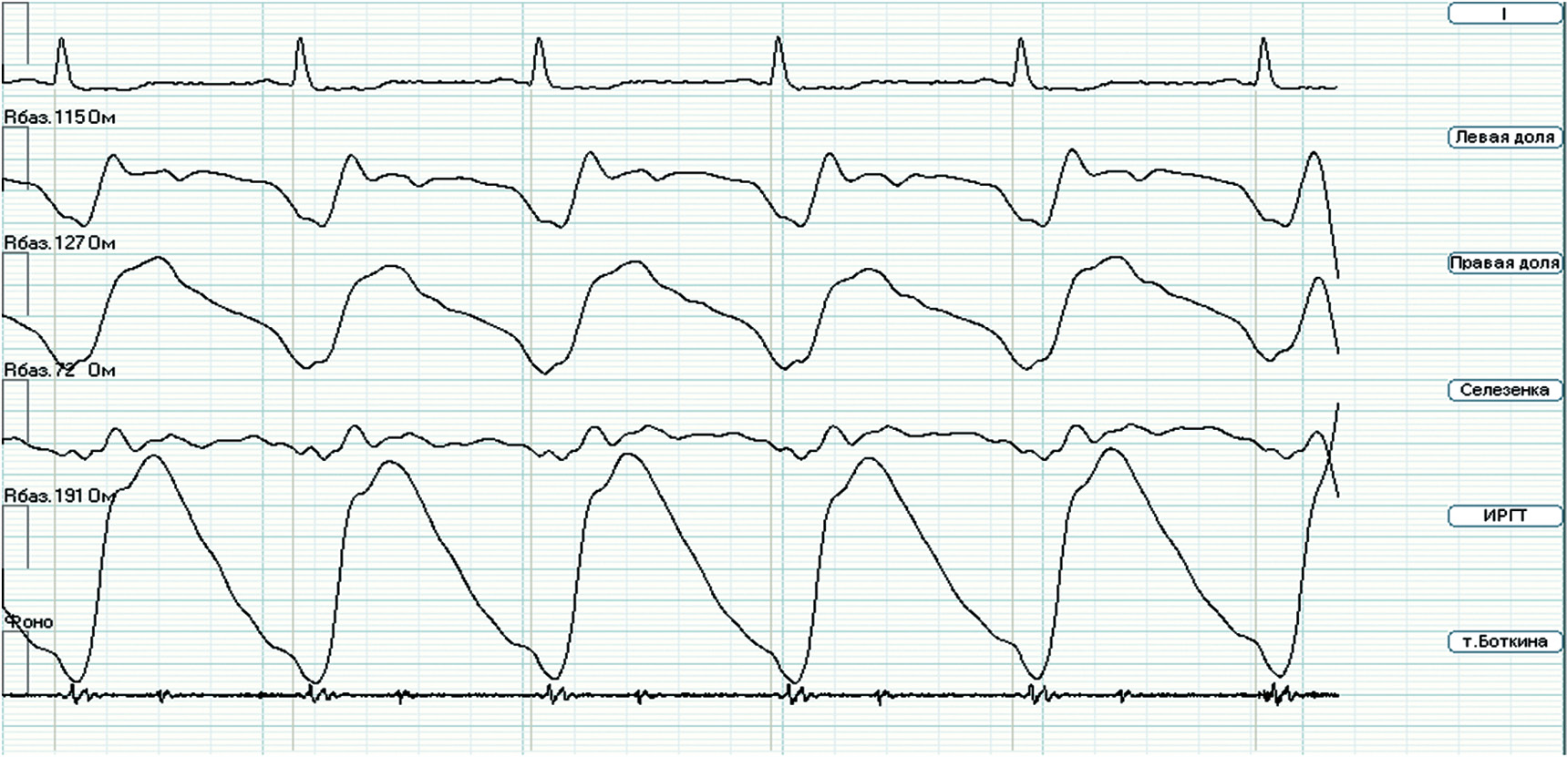 Уникальность внутрипеченочного кровотока заключается в том, что до 70 % притока крови обеспечивается венозной кровью системы портальной вены со сравнительно небольшим градиентом давления, и, следовательно, состояние внутрипеченочного кровотока существенно зависит от гемодинамической функции ПЖ. Соответственно, даже несущественное снижение насосной функции ПЖ значимо влияет на изменение формы реограмм в области проекции печени.