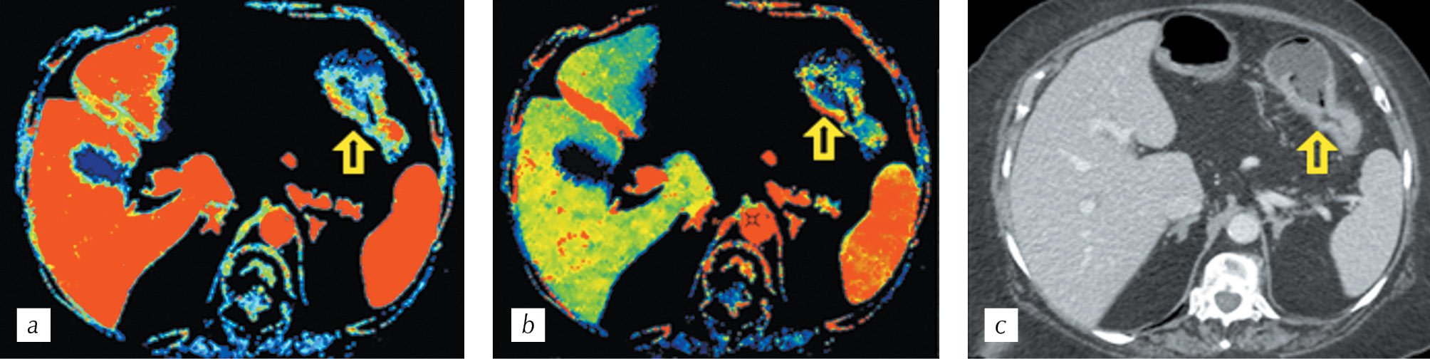 Рис. 4. Перфузионная компьютерная томография (a, b). Цветные параметрические карты: а — объема и b — скорости кровотока, демонстрирующие патологический повышенный кровоток в стенках стенозирующей опухоли селезеночного изгиба ободочной кишки (стрелки); с — спиральная компьютерная томография. Мультипланарная реконструкция в аксиальной плоскости в портальную фазу сканирования