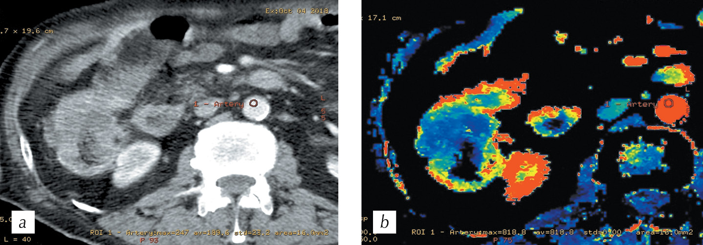 Рис. 6. Спиральная компьютерная томография, мультипланарная реконструкция в аксиальной плоскости в артериальную фазу сканирования (a), на которой между образованием восходящего отдела ободочной кишки и капсулой почки прослеживается тонкая разделительная полоска жировой клетчатки; b — перфузионная компьютерная томография, цветная параметрическая карта объема кровотока, демонстрирующая инвазию жировой клетчатки и капсулы почки образованием восходящего отдела ободочной кишки