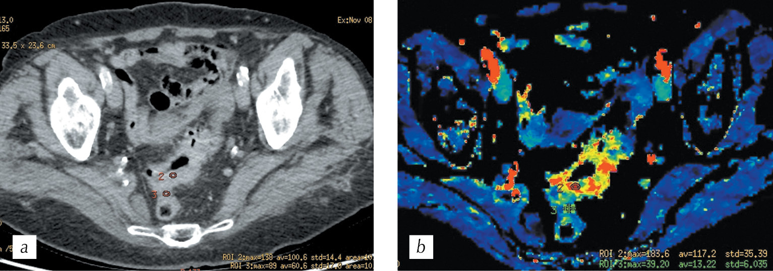 Рис. 7. Спиральная компьютерная томография, мультипланарная реконструкция в аксиальной плоскости в портальную фазу сканирования (a) и перфузионная компьютерная томография, цветная параметрическая карта скорости кровотока (b) с метками ROI 2 в инвазивной части опухоли и ROI 3 в смежных интактных стенках кишки