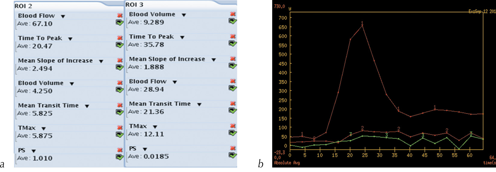 Fig. 11. Summary tables of perfusion parameters (a), the density-time graph (b) for ROI 2 and ROI 3 in thickened colon walls with signs of colitis