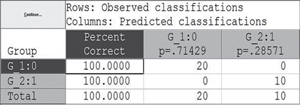 Достоверность выведенных дискриминантных функций р < 0,0000 оказалась ниже р < 0,05.