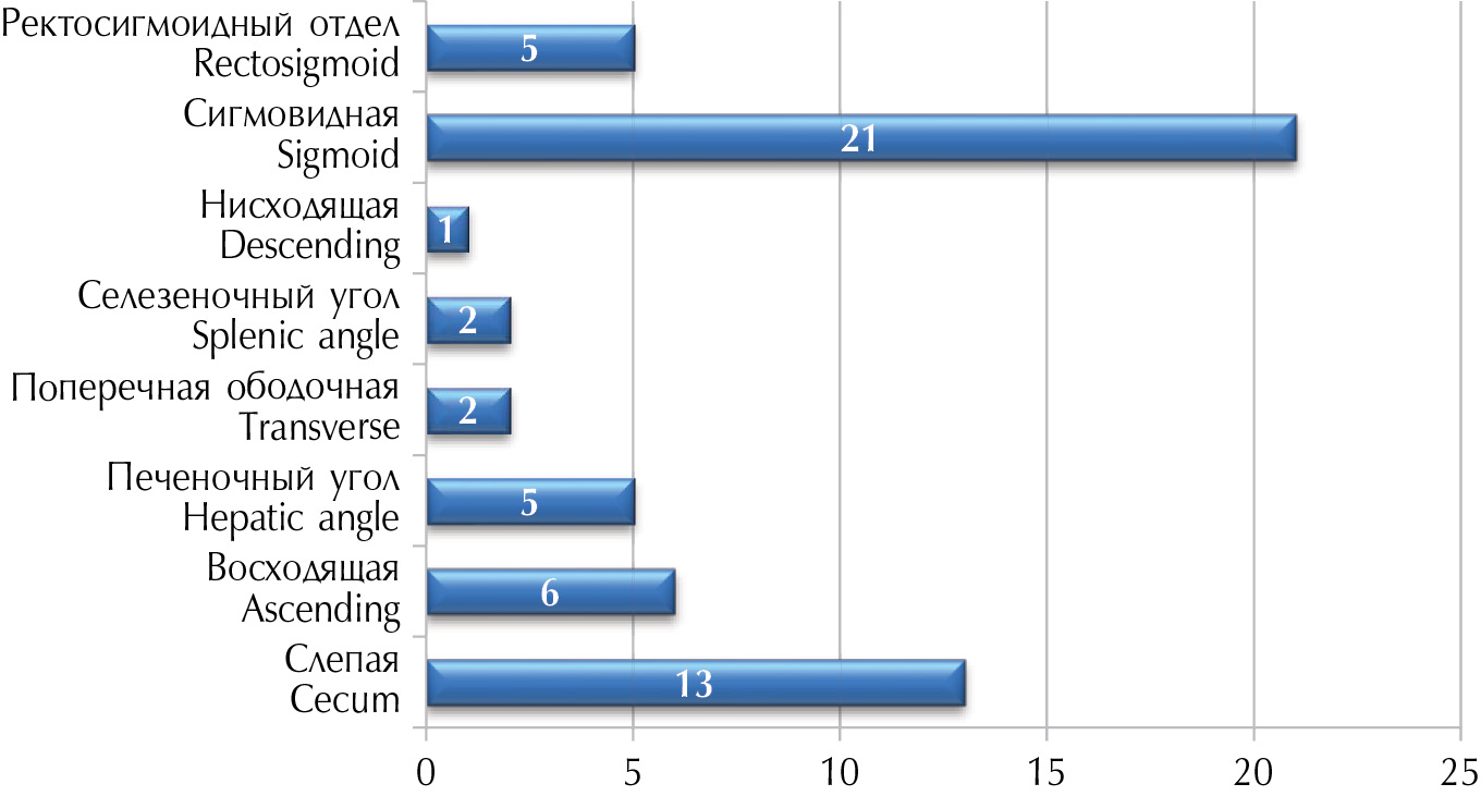 Для больных РОК, осложненным ПФВ, была характерна поздняя госпитализация: большинство больных — 47 (85,5 %) — поступили в срок более суток от момента начала заболевания, при этом 35 (63,6 %) пациентов поступили позже 6 сут и только 8 (14,5 %) пациентов — в первые сутки от начала заболевания. Ввиду особенности гериатрического контингента госпиталя сопутствующая патология в той или иной степени наблюдалась у всех больных. Наиболее часто встречались заболевания сердечно-сосудистой (98 %), неврологической (97,6 %) и мочевыделительной систем (67,7 %). Нередко на одного пациента приходилось до 6 сопутствующих заболеваний. Влияние полиморбидности на течение периоперационного периода оценивали с помощью возраст-зависимого индекса Charlson, средний показатель которого составил 8,4 при вариации от 5 до 12. Операционно-анестезиологический риск оценивали по шкале АSA. У 32 (58,2 %) пациентов зарегистрирована III степень операционно-анестезиологического риска, у 17 (30,9 %) — IV степень, у 6 (10,9 %) — вторая. Чаще опухоли локализовались в сигмовидной — 21 (38 %) и слепой — 13 (24 %) кишке (рис. 1).