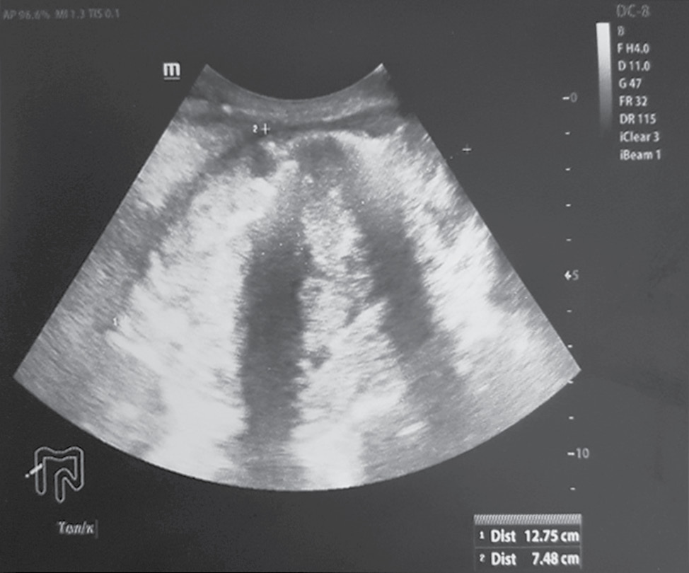 Всем больным в обязательном порядке в течение двух часов от момента поступления проводили обследования в минимальном объеме, включавшие обзорную рентгенографию живота и грудной клети, ЭКГ, УЗИ органов брюшной полости и почек, клинический анализ крови, биохимический анализ крови, общий анализ мочи, осмотр терапевта. При рентгенографии живота, как правило, наблюдался пневматоз толстой кишки, реже пневматоз тонкой кишки. Рентгенологическая картина менялась при развитии распространенного перитонита — появлялись тонко- и толстокишечные уровни, кишечные арки. Ультразвуковое исследование играло вспомогательную роль в постановке правильного диагноза с определением тактики дальнейшего лечения. Параколярный инфильтрат в виде местного уплотнения ткани в проекции предполагаемой опухоли по данным УЗИ был выявлен у 16 (65,5 %) больных (рис. 2).