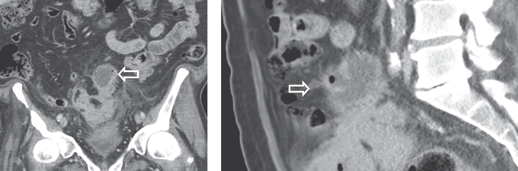 Рис. 3. Опухоль ректосигмоидного отдела толстой кишки, осложненная перифокальным воспалением с формированием паратуморозного абсцесса