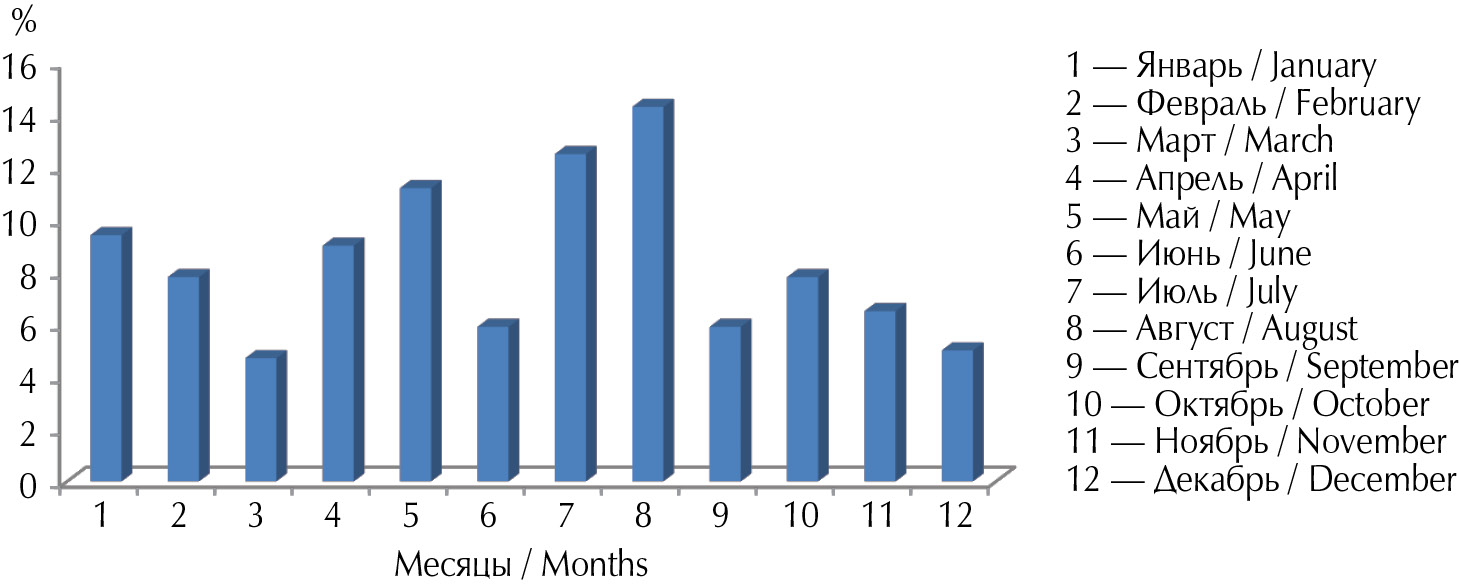 Рис. 1. Распределение случаев позвоночно-спинномозговой травмы по месяцам