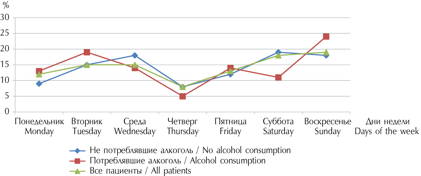 Наиболее травмоопасными оказались выходные дни, как и в исследовании из Архангельска [4]. Чаще всего ПСМТ происходила в выходные дни — в субботу и воскресенье, реже всего — в четверг (p < 0,05) (рис. 2).