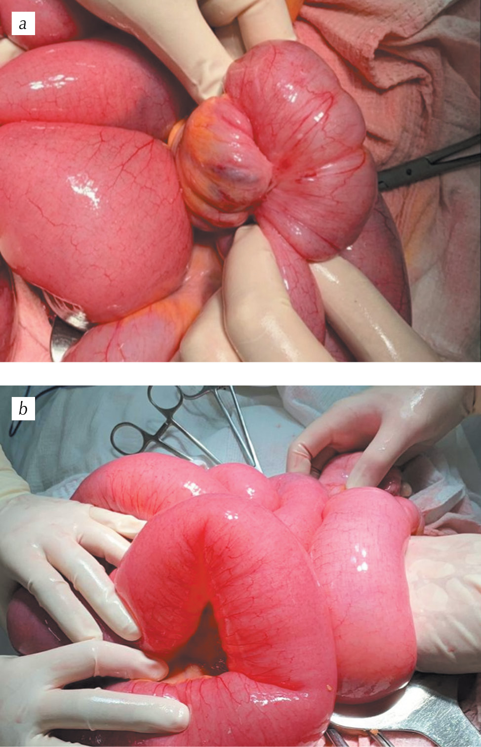При поступлении пациентка обследована. По результатам гастроскопии отмечались признаки нарушения эвакуации содержимого желудка и двенадцатиперстной кишки. При проведении ректороманоскопии ампула прямой кишки пустая, наблюдались признаки проктосигмоидита, хронического комбинированного геморроя вне обострения. На обзорной рентгенограмме органов брюшной полости определялись перераздутые петли тонкой кишки с горизонтальными уровнями жидкости, в меньшей степени были перераздуты петли левой половины толстой кишки. По данным ультразвукового исследования органов брюшной полости во всех отделах визуализировались расширенные до 40 мм петли тонкой кишки, заполненные жидким содержимым, с маятникообразными движениями жидкости, стенка кишки утолщена до 4,8 мм, поперечные складки гипертрофированны, присутствовали признаки выраженного нарушения кишечной проходимости. При этом лабораторные показатели крови были без значимых изменений. На основании данных клинической картины, инструментальных методов исследования сформулирован диагноз острой кишечной непроходимости и определены показания для экстренной операции.