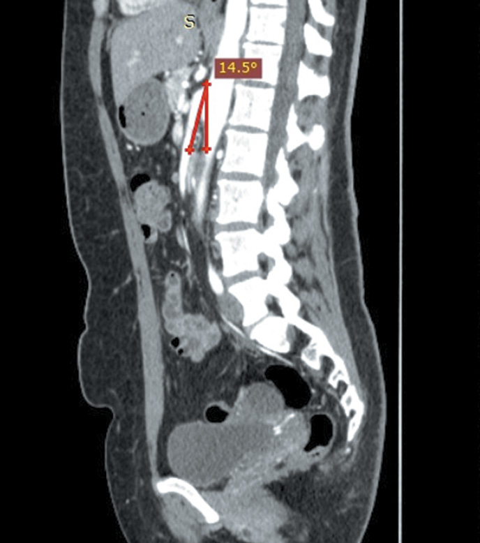 18.09.2019 выполнена контрольная спиральная компьютерная томографическая ангиография, по данным которой верхняя брыжеечная артерия длиной 5 мм отходит от аорты под острым углом (14,5°) (рис. 2).