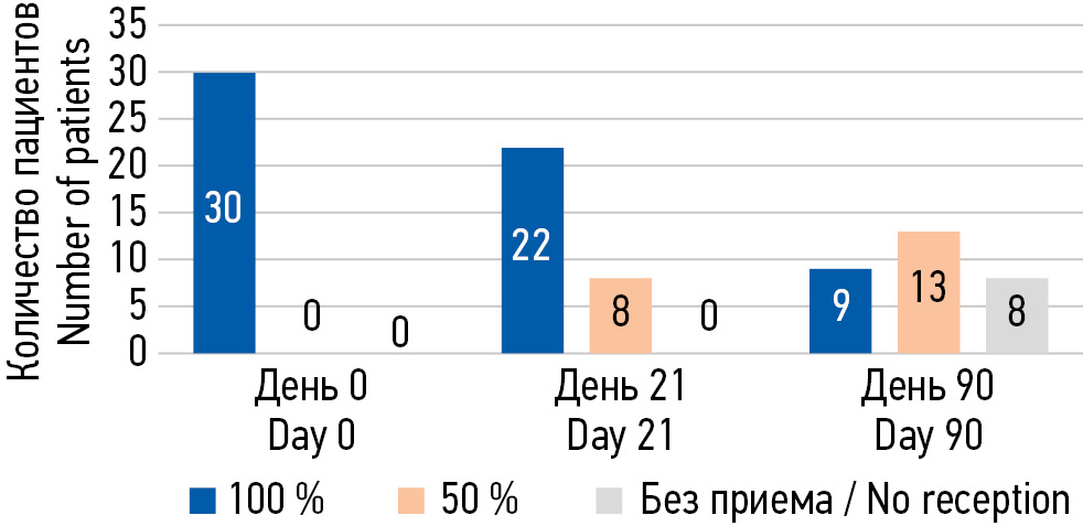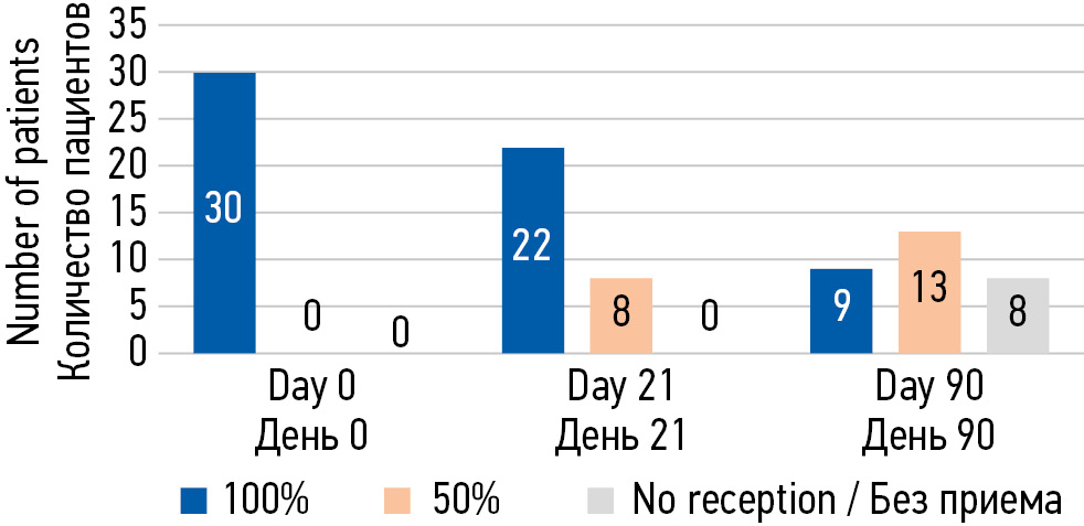 During the therapy, no adverse reactions were detected. All 30 patients completed the study, indicating a compliance rate of 100%.