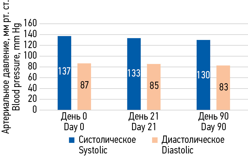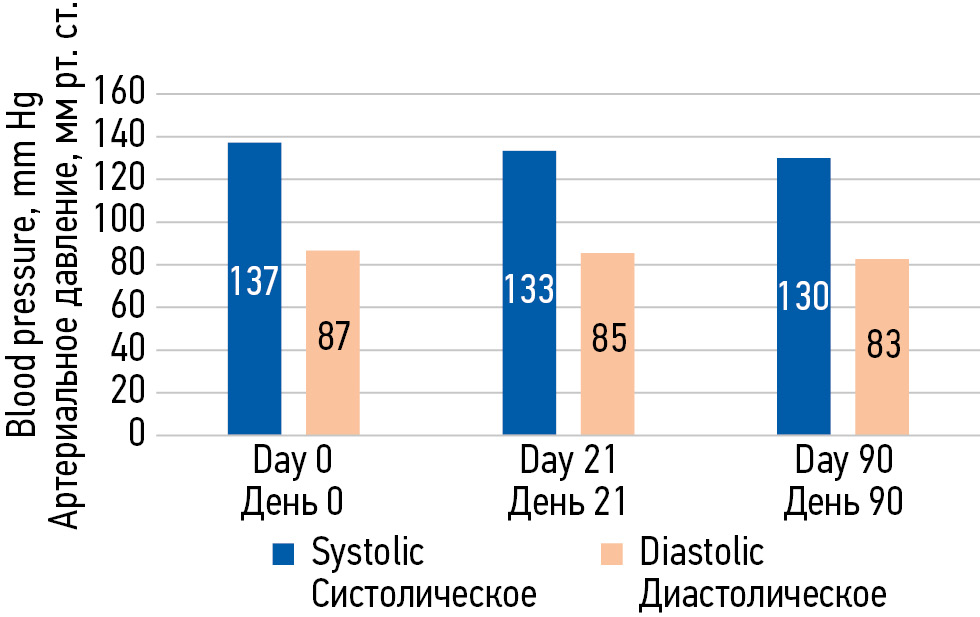Рис. 2. Динамика систолического и диастолического артериального давления по результатам разовых измерений на визитах