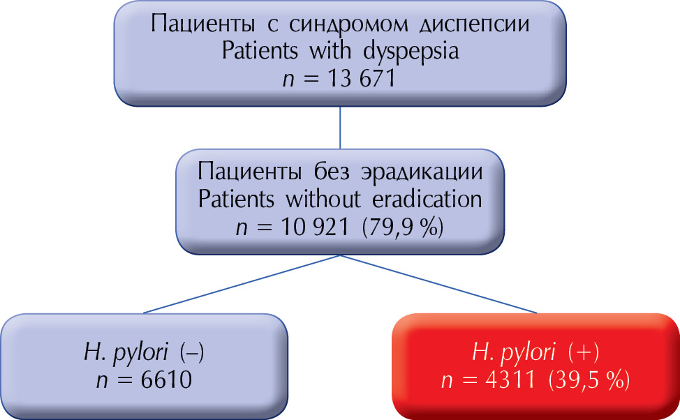 Рис. 1. Распространенность инфекции Helicobacter pylori среди пациентов с синдромом диспепсии (13С-уреазный дыхательный тест)