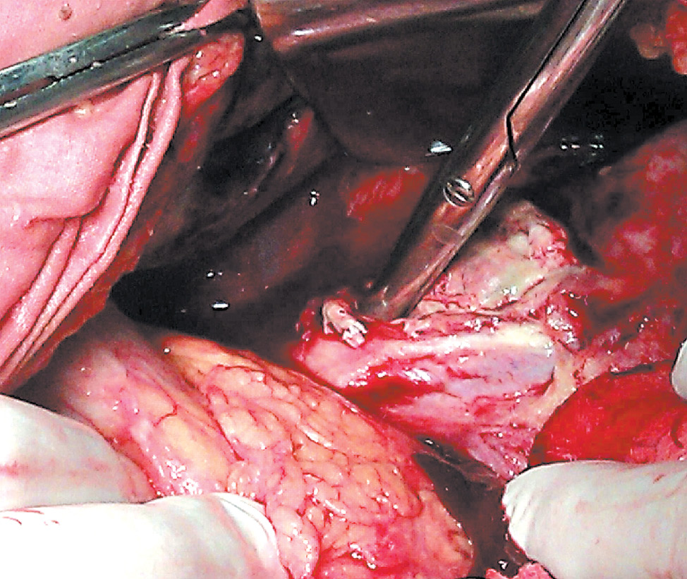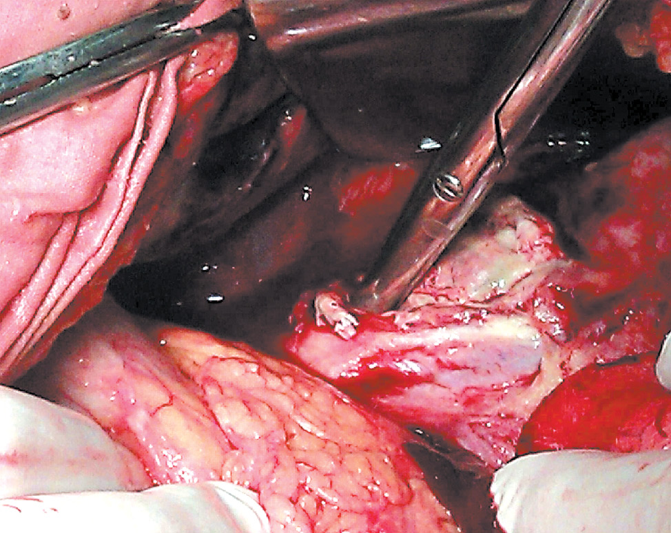 In this case, hemostasis was caused by a foreign body, namely a fragment of an abrasive disc which, having pierced the structures between the transverse processes of vertebrae С5–С6, was stuck firmly in the body of vertebra С5. When the foreign body was removed, major bleeding from the wound channel occurred. Temporary hemostasis was achieved by an original method, namely compression of segment II of the right vertebral artery with rigid branches through the intertransverse ligaments. Revision revealed a complete traumatic transection of the right vertebral artery in segment II, injury to the oropharynx, upper third of the esophagus, vertebral body of С5, and nerve roots of С5–С6. After ligation of the vertebral artery in segment I, the canal of segment II of the artery was partially opened (Fig. 4) and the bone defect was filled with a composition of wax and a hemostatic sponge.