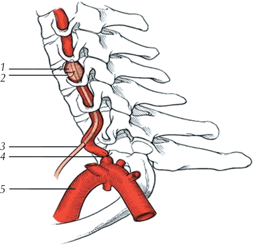 Рис. 1. Баллонная обтурация повреждения II сегмента позвоночной артерии: 1 — баллон катетера; 2 — область повреждения артерии; 3 — катетер; 4 — область лигирования артерии; 5 — подключичная артерия [12]