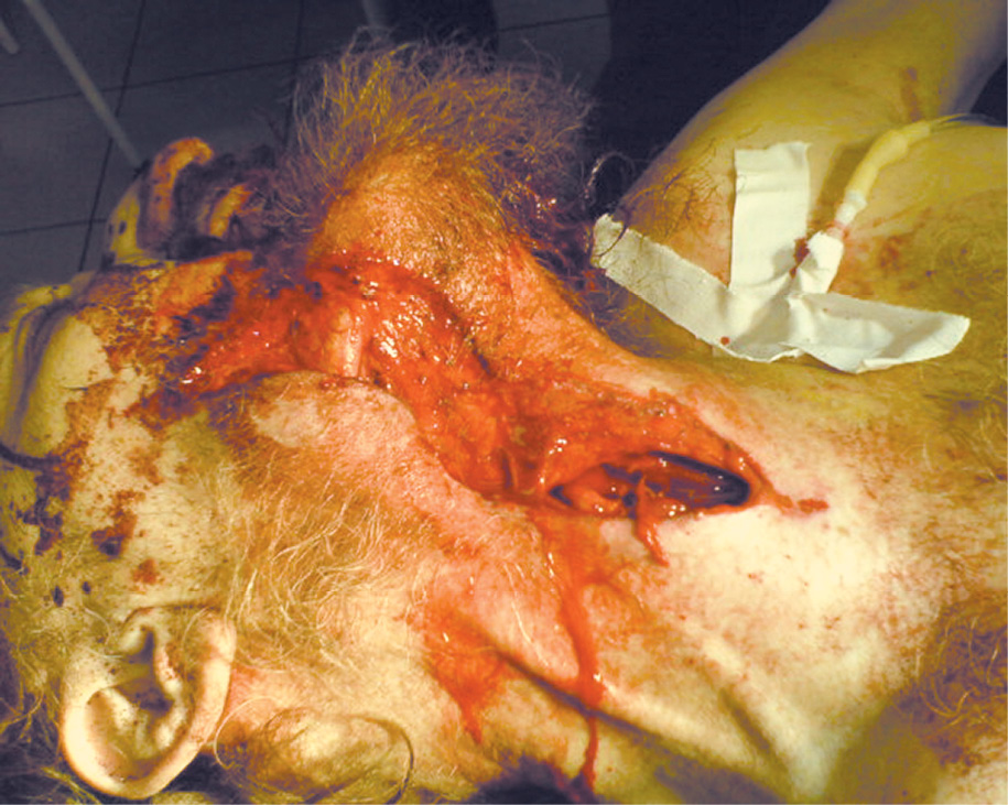Male patient B., 48 years old, was admitted to City Hospital No. 26 with a diagnosis of incised wound on the right half of the face with a transition to the anterolateral surface of the neck. The wound was caused by the fragment of a cutter during plumbing work (Fig. 3).