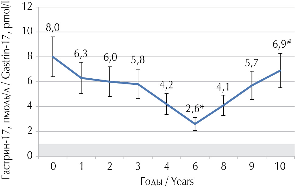 Рис. 3. Гастрин-17 базальный (M ± SD) в сыворотке крови пациентов с H. pylori-ассоциированным аутоиммунным гастритом в различные годы наблюдения (n = 58). Серым выделен диапазон значений, характерный для атрофического гастрита антрального отдела желудка. * р < 0,05 по сравнению с исходным значением (0 год); # р < 0,05 по сравнению со значением на шестой год наблюдения