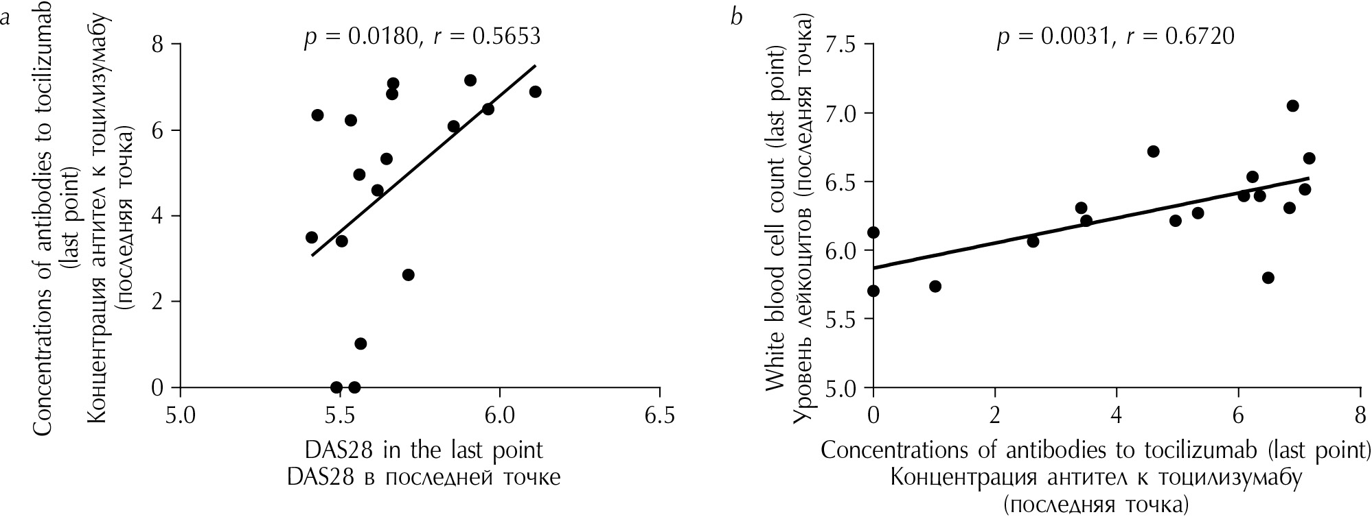 Рис. 1. Корреляция между концентрацией антител к тоцилизумабу с DAS28 (a) и количеством лейкоцитов (b)
