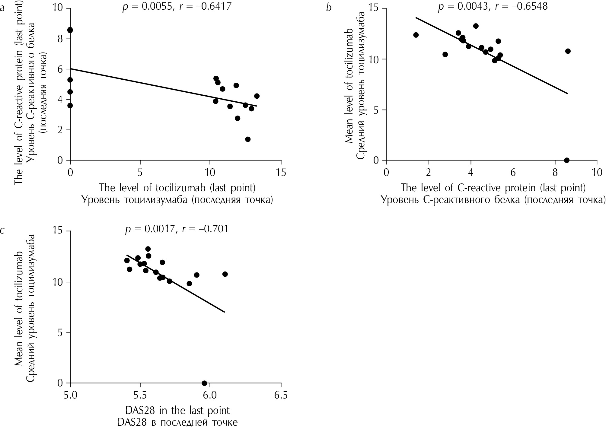 Рис. 2. Корреляция уровня тоцилизумаба с уровнем С-реактивного белка (a) и среднего уровня тоцилизумаба с содержанием С-реактивного белка (b) и DAS28 (c)