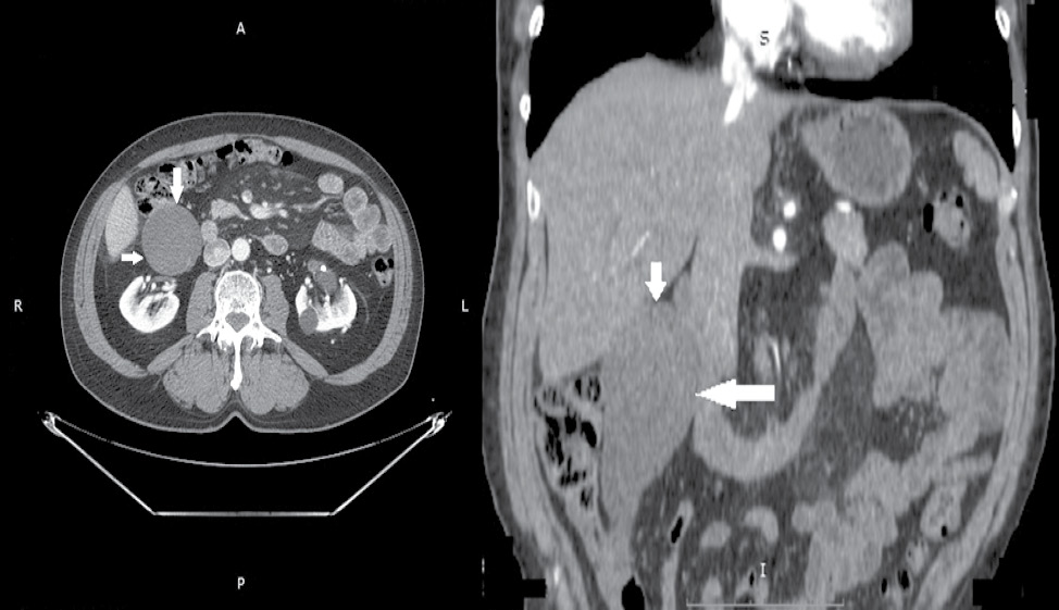 Fig. 1. Spiral CT picture of abdominal organs with contrast (arrows indicate a pathological formation)