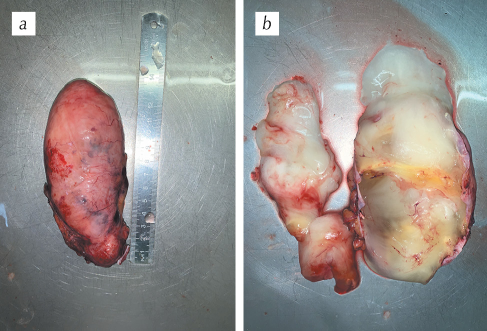 Рис. 3. Удаленный червеобразный отросток с мукоцеле: а — препарат до вскрытия; b — препарат вскрыт
