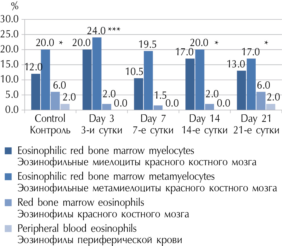 It is interesting to study the dynamics of reactive changes after local cold injury. So eosinopenia appears itself already on day 3. On day 7 after local cold injury, the median content of bone marrow eosinophils reached a minimum value of 1.5% (0.0; 5.75), as a result of which the difference in the content of eosinophils in the red bone marrow and peripheral blood disappeared (W = –1.6; p = 0.1), which was a difference from the indicators in the previous and subsequent days of the experiment. A decrease in the concentration of bone marrow eosinophils was accompanied by a decrease in the eosinophilic myelocyte concentration to a minimum (10.5% [9.0; 13.5]). On day 14, the content of myelocytes and bone marrow eosinophils increased, and the difference in the concentration of eosinophils in the red bone marrow and peripheral blood was restored (W = –2.03; p = 0.04). Only on day 21 after local cold injury, the content of bone marrow and blood eosinophils was comparable with these indicators in the control group.