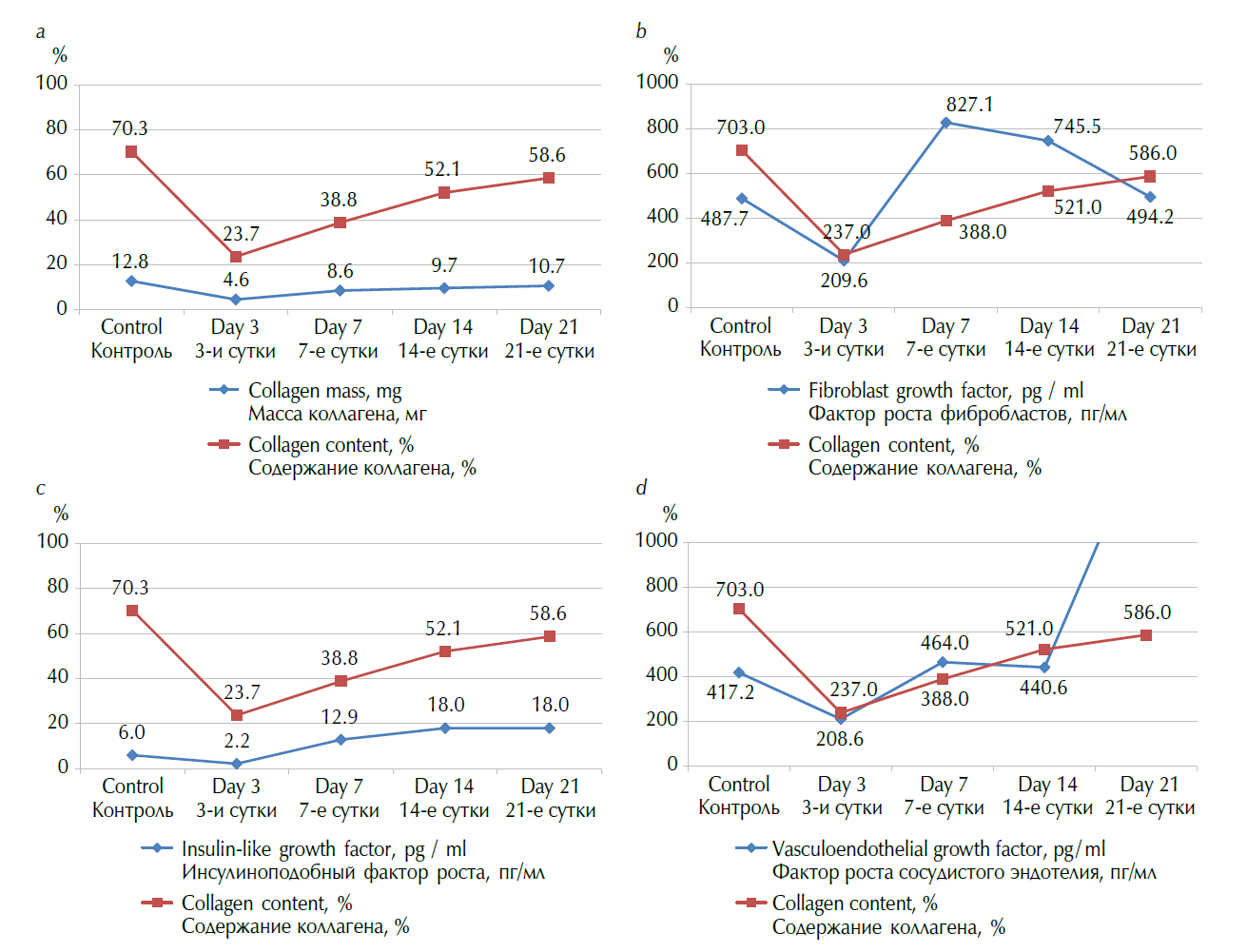 Рис. 2. Динамика концентрации факторов роста и содержания коллагена