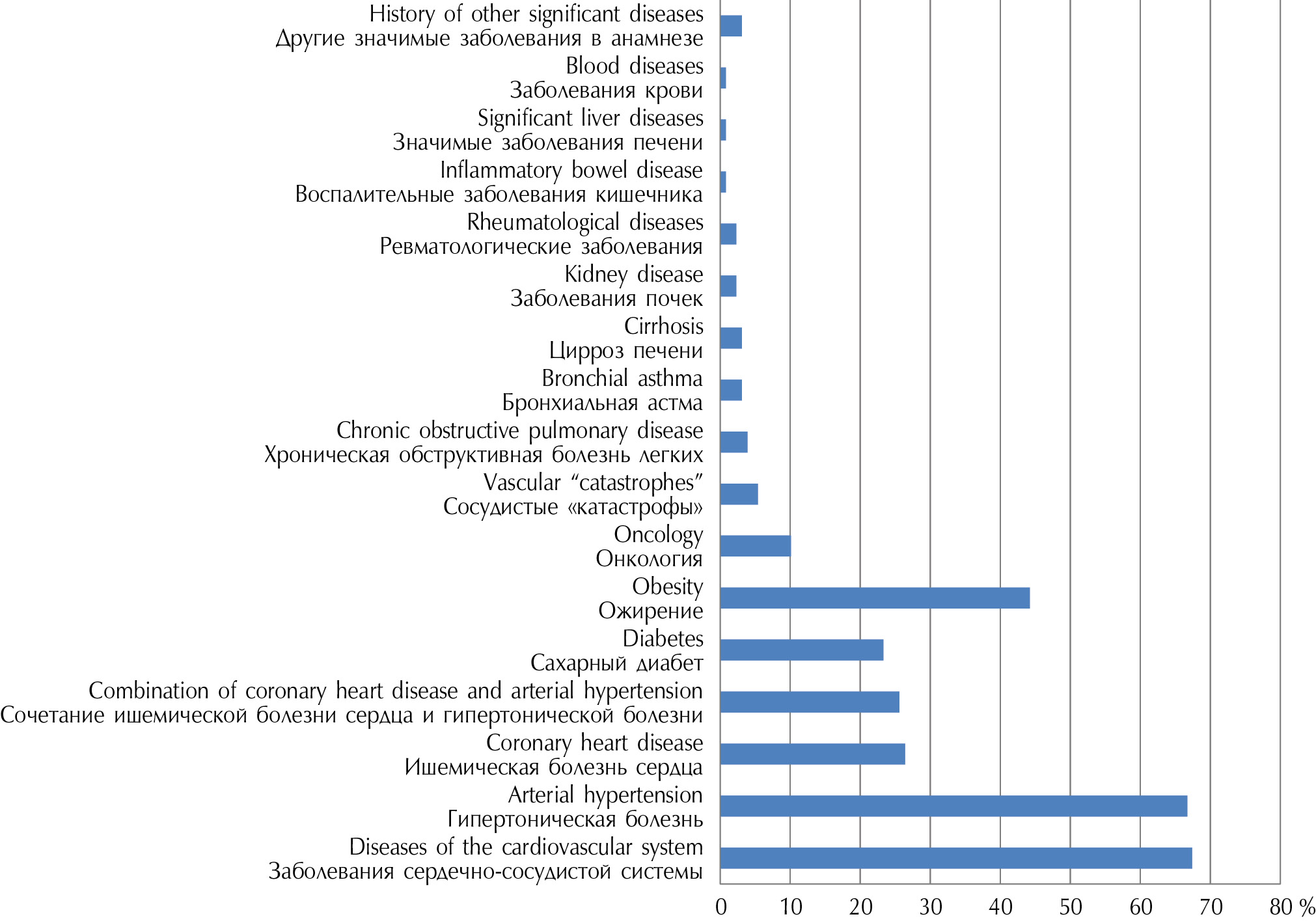 Currently, considering the data of real clinical practice, many questions arise about the features of the course of COVID-19, depending on sex and age, the presence of various concomitant diseases, and the choice of the most effective treatment methods, depending on clinical and laboratory data and computed tomography (CT) findings of lung damage. The search of the most informative predictive markers of COVID-19 for comorbid patients is equally important. In this regard, it is necessary to study the features of screening, prevention, diagnosis, clinical manifestations, and treatment of COVID-19.