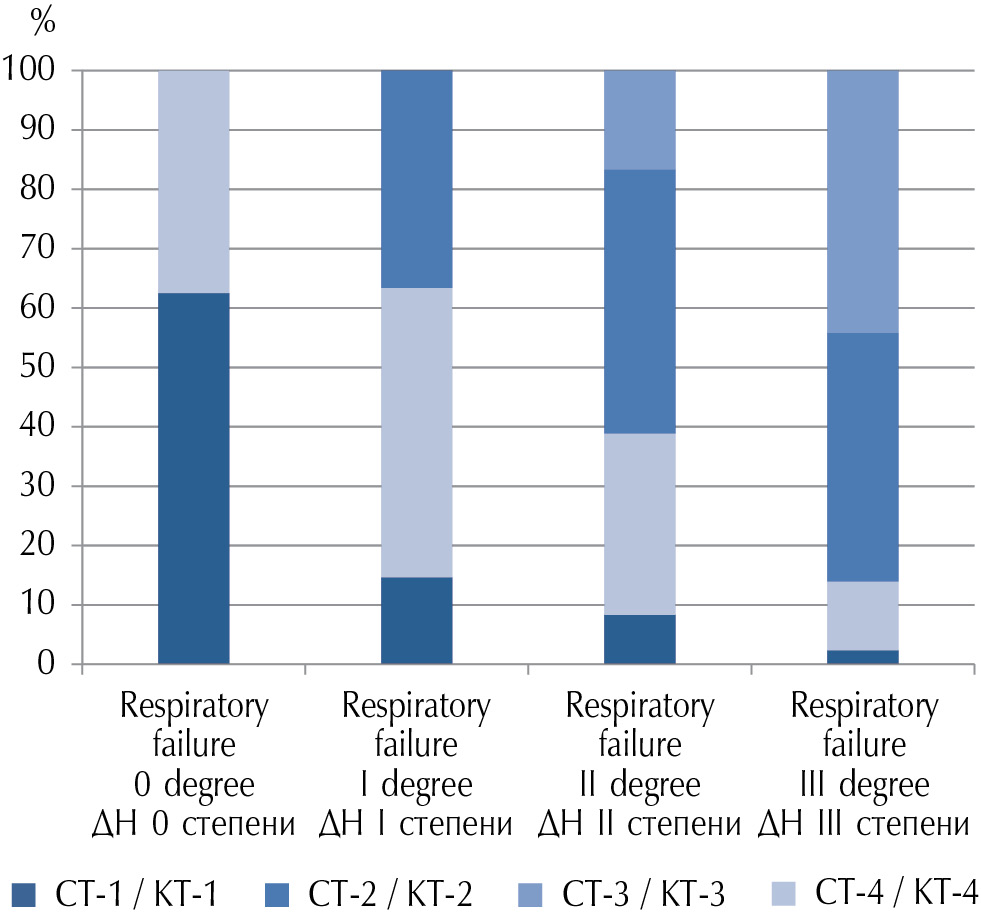 Data on the presence of RF depending on the lung damage on CT are interesting (Fig. 4). Thus, only CT-1 or CT-2 lung damage was detected on CT in patients with no RF during hospitalization. Almost all patients (86.1%) with grade III RF had CT-3 or CT-4 (the volume of the lesion is >50%). However, the volume of lung lesion according to CT data may be CT-1 or CT-2 even in the absence of RF.