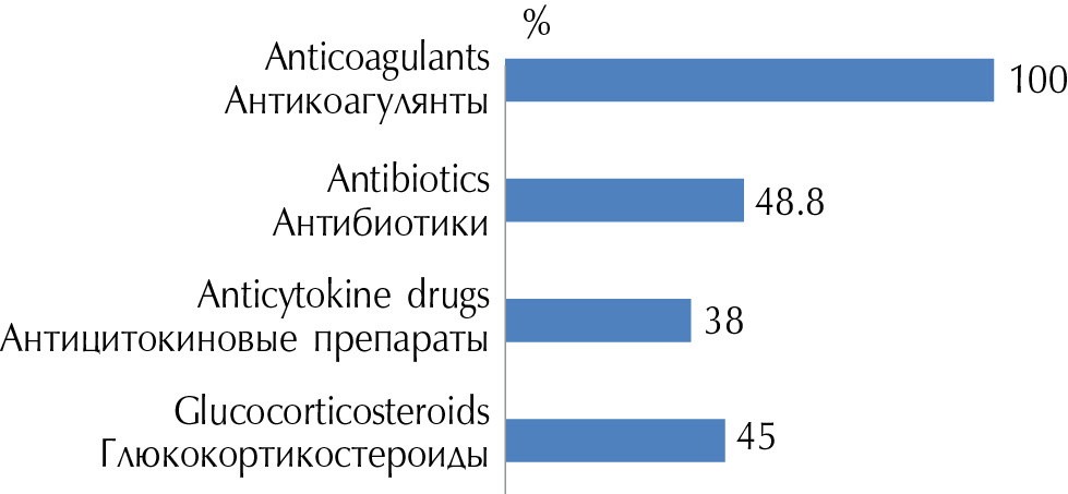 When clinical and laboratory signs of a cytokine storm appeared, pathogenetic therapies were used, including anticytokine drugs (ADCS) — IL-6 receptor blockers and Janus kinase inhibitors, as well as glucocorticosteroids (GCS). Currently, clinical studies of the effectiveness and safety of ADCS and GCS in COVID-19 are ongoing. However, according to the temporary guidelines of the Ministry of Health of the Russian Federation, the appointment of GCS can be a means of blocking the synthesis of a wide range of proinflammatory mediators, an increase in the concentration of which is associated with the development of ARDS and sepsis. The regulatory documents specifically emphasize the inexpediency of prescribing GCS to all patients with COVID-19. The above factors were the basis for using GCS and ADCS in 45% and 38% of patients, respectively.
